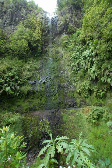 Wir verlassen die Levada und folgen einem holprigen Weg zum Talschluss Caldeirao Verde, den wir nach 1 h 50 Minunten (6,2 km) erreichen. Hier stehen wir vor einem etwa 100 m dünnen Rinnsal und sind kreisförmig von senkrechten Felswänden umgeben. Aber nicht nur das, sondern auch massenhaft von Wanderern. Man hat den Eindruck, dass man hier eine paar Busse abgeliefert hat. Unterwegs haben wir allerdings nicht viele getroffen.