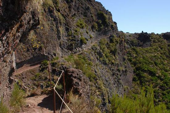 Der Weg ist spektakulär! Über einen eigentümlich geformten Grad aus rotem und gelben Vulkangestein, schwindelerregenden Tiefen, teilweise extrem hohen Steinstufen - aber alles gut gesichert - erreichen wir nach nicht ganz einer Stunde den Eingang des Tunel Pico do Gato (Katzengipfel). Der Tunnel ist ca. 100 m lang (Taschenlampe!).