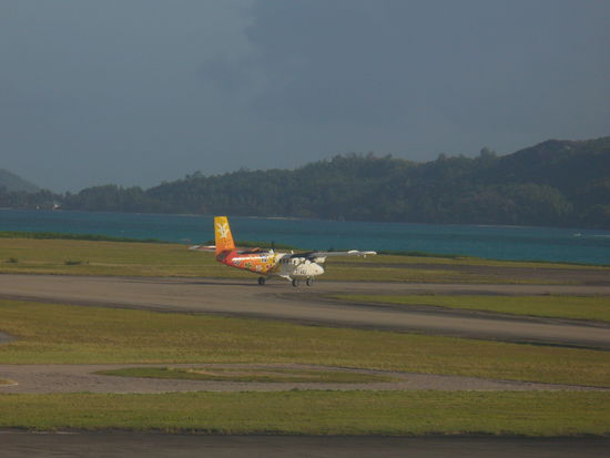 Mit wackeligen Knien torkelten wir zum "Domestic-Airport", denn leider mussten wir gleich weiterfliegen nach Praslin. Dort erklärte man uns, der Pilot sei erstmal "zur Probe" nach Praslin geflogen, ohne Passagiere...Während wir auf das Ergebnis dieses Testfluges warteten und ich mich nach Irland wünschte, schüttete es draußen. Alles grau in grau. Das Flugzeug, ein erschreckend winziges Propellermaschinchen, kehrte wohlbehalten zurück, bereit für mutige Passagiere (oder solche, die es werden wollten). Nach der vorsorglichen Einnahme von Superpep Forte kletterten wir in die Twin Otter.