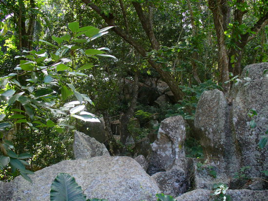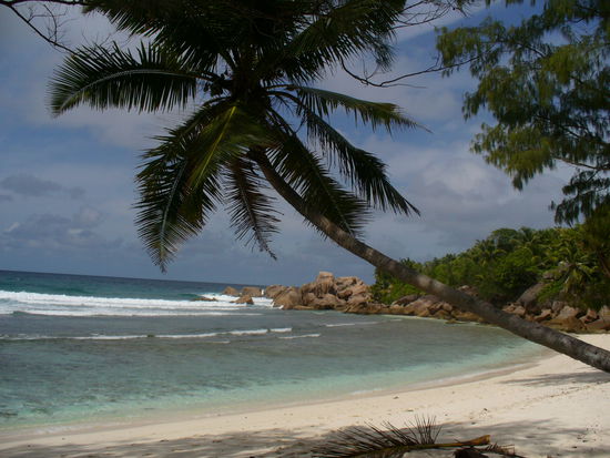 Die Anse Cocos war sehr leicht zu finden. Ein wunderschöner Strand mit den üblichen schrägen Palmen und Granitfelsen. Zum Schwimmen etwas zu wellig für meinen Geschmack, aber gut für ein erfrischendes Sitzbad. Auf den Felsen links waren ganz viele dieser lustigen Felsenhüpfer, Rockskipper heißen die glaube ich. Nachdem ich ein paar Minuten auf einem schönen warmen Felsen rumgelungert hatte, geriet ich durch das Wellengeplätscher in leichte Trance und musste sämtliche Willenskraft aufbringen, um wieder zurückzugehen. Dabei traf ich lustigerweise Nevis, der gerade Muscheln sammelte. Er holte auch gleich wieder 2 leckere Kokosnüsse für uns. Während Nevis und Sonja ihre Muschelausbeute verglichen, lag ich nur benebelt da und ließ den Strand auf mich wirken. Na gut, kann sein, dass ich kurz eingeschlafen bin...