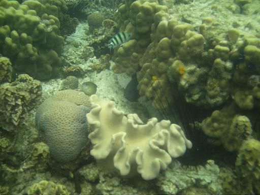 Aber mal von Anfang an. Am ersten Tag nach unserer Ankunft haben wir uns in unserem Guest House Schnorchel und Flossen ausgeliehen und sind zu einem anderen Strand gelaufen, an dem man wohl super schnorcheln koennte. Martin ist dort das allererste Mal geschnorchelt. Nach leichten Anlaufschwierigkeiten (das Wasser war durch die Ebbe sehr seicht) hat das dann gut geklappt. Ist ja auch eigentlich nicht schwer. Und schon dort gab es schon sooo viel zu sehen. Es wimmelte von harten und weichen Korallen und jede Menge bunte Fische waren auch da. Einer von diesen hat uns immer wieder angegriffen (er war geschaetzte 8cm gross), weil er meinte, wir wuerden seine Futterquelle leer fressen wollen. Schon klar. Leider hat nur die Sonne nicht geschienen, deswegen sind die Farben nicht so bunt. Hier trotzdem mal ein paar Impressionen: