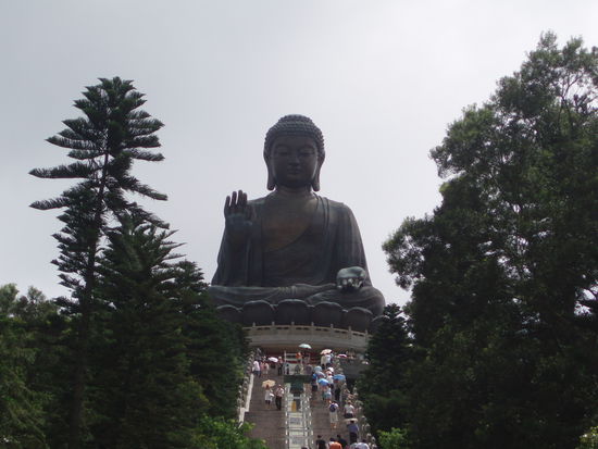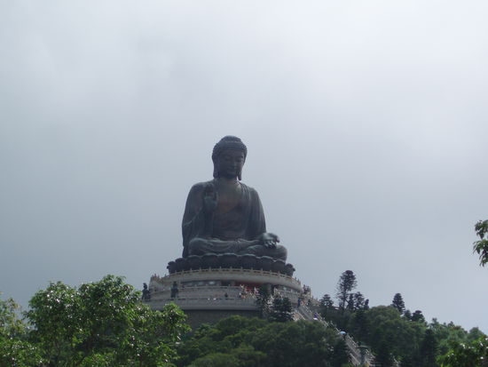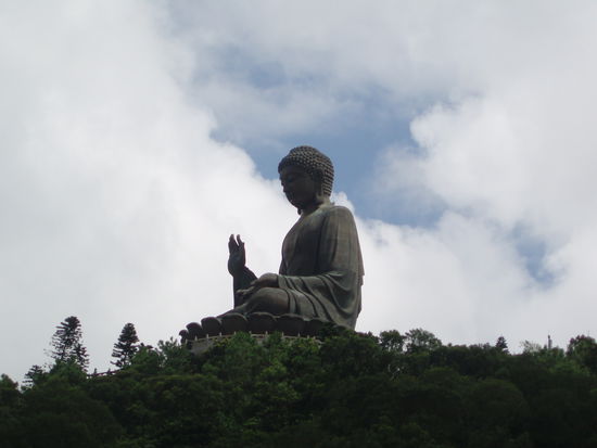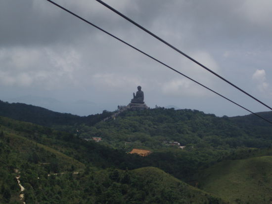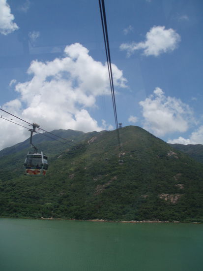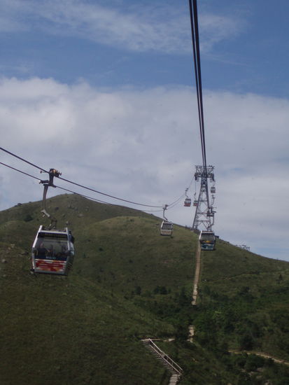 Endlich ging es los. Da ich alleine reiste, wurde ich noch zu drei chinesischen Pärchen in eine Gondel gequetscht und die Fahrt begann. Hinweg über die grünen Berge am Rande Hong Kongs ging die überaus schnelle Fahrt mit der Seilbahn. Ihr Ziel war das Dorf Ngong Ping (nach diesem heißt die Bahn auch "Ngong Ping 360") und der daneben gelegene Big Buddha. Dieser Buddha ist der größte frei sitzende Buddha der Welt und der fünftgrößte Buddha in China.