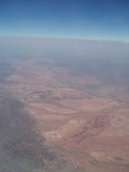 Auch der Flug ging sehr schnell vorbei, da er nur zwei Stunden dauerte und es in der Zeit auch noch Mittagessen gab. Ich hatte wieder einen Fensterplatz bekommen und war richtig happy, denn so konnte ich sehen, wie sich nach und nach die Landschaft veränderte: Das Grün der Tablelands und der Regenwald wichen zunächst graugrünem Buschland. Nach etwa einer Stunde dann breitete sich der orange-rote Farbton des Outbacks unter uns aus, nur unterbrochen von bizarren Flussformen. Ich konnte kaum fassen, dass ich dies nun wirklich sah und über das Outback flog!
