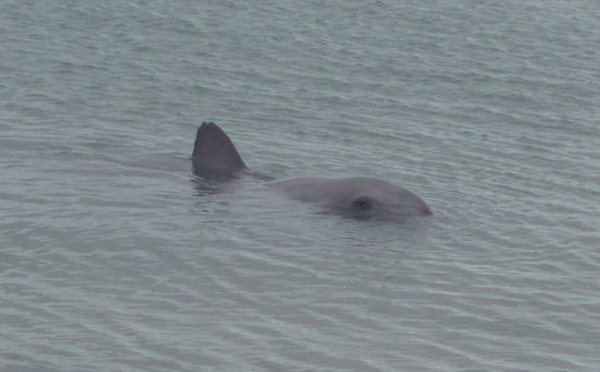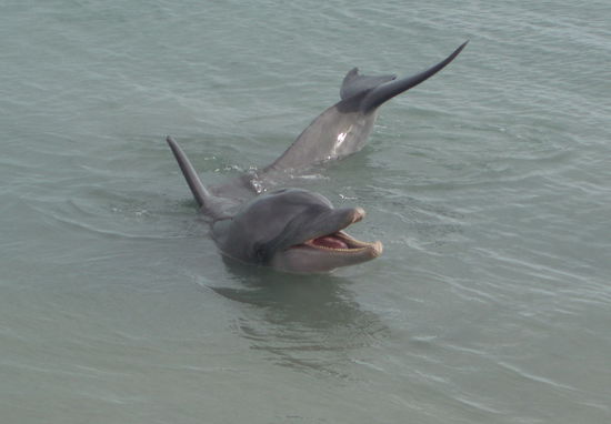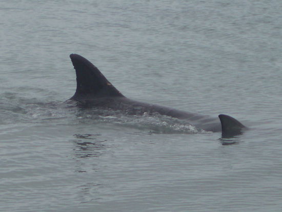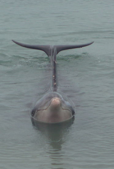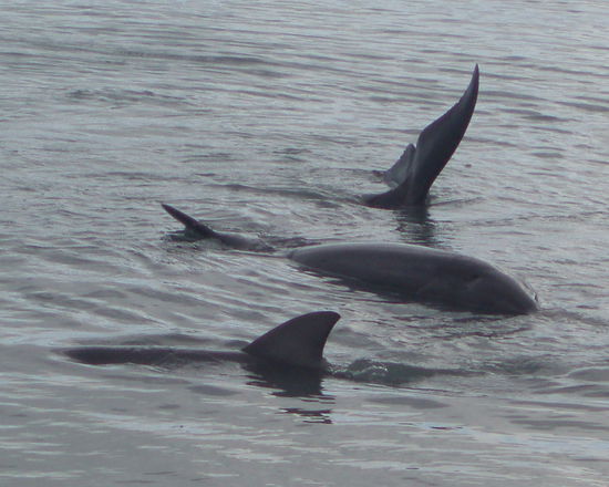 Irgendwann kam tatsächlich der erste Delfin in Sicht, und prompt stürzte die ganze Menschenmenge noch einmal ein Stück nach vorne, bis die erste Reihe direkt am Wasserrand stand.