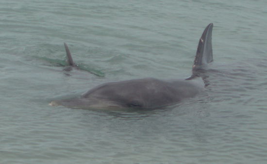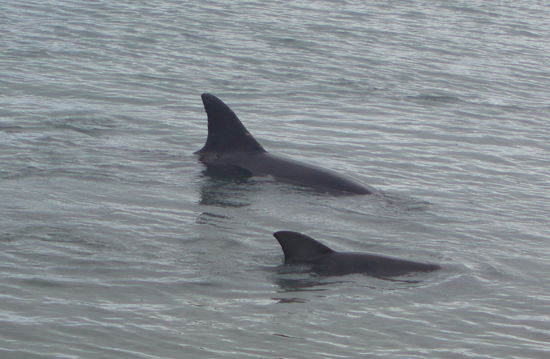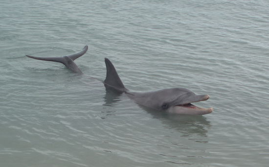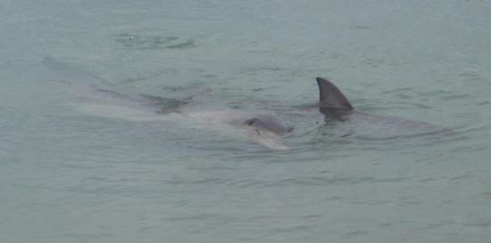 Nach der Fütterung strömten die meisten Leute in die Cafés, aber ich ließ unser Gruppenfrühstück ausfallen und blieb am Strand, da die Ranger gesagt hatten, dass die Delfine oft nochmal zurückkamen. Und tatsächlich kehrten ein paar wieder an den Strand zurück, und nun konnten die wenigen Besucher, die am Strand geblieben waren, sie noch einmal in viel ruhigerer Atmosphäre sehen. Ich genoss jede Sekunde, die ich sie beobachten durfte, vor allem natürlich das Baby und seine Mutter.