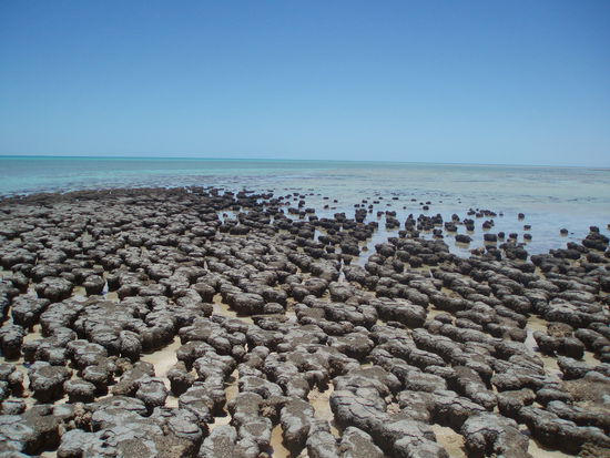 Weiter ging es mit der Erkundung der Shark Bay Halbinsel: Wir stoppten bei den Stromatolithen am Hermelin Pool. Stromatolithen sind biogene Steine, also Mikroorganismen, und werden als lebende Fossilien bezeichnet. Warum sie genau leben oder was sie genau machen, habe ich leider nicht genau verstanden, bzw. reicht dafür mein Wissen in diesem Gebiet nicht aus. Aber auf jeden Fall sind sie eine der ältesten Formen von Lebewesen und mit dafür verantwortlich, dass der Mensch überhaupt entstehen konnte - also sollten wir uns mal artig bedanken, oder sie doch lieber verfluchen?