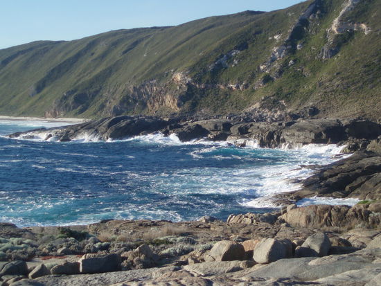 Im letzten Licht des Tages fuhren wir noch in den Torndirrup National Park, um die Felsformationen Natural Bridge und The Gap zu sehen, und dann zu den Blowholes. Bei starkem Wellengang bläst hier der Wind durch Löcher in den Felsen nach oben, und wer sich über so ein Loch setzt, wird fast weg gepustet. Mehr als einer von uns verlor dabei unwiederbringlich seine Sonnenbrille!