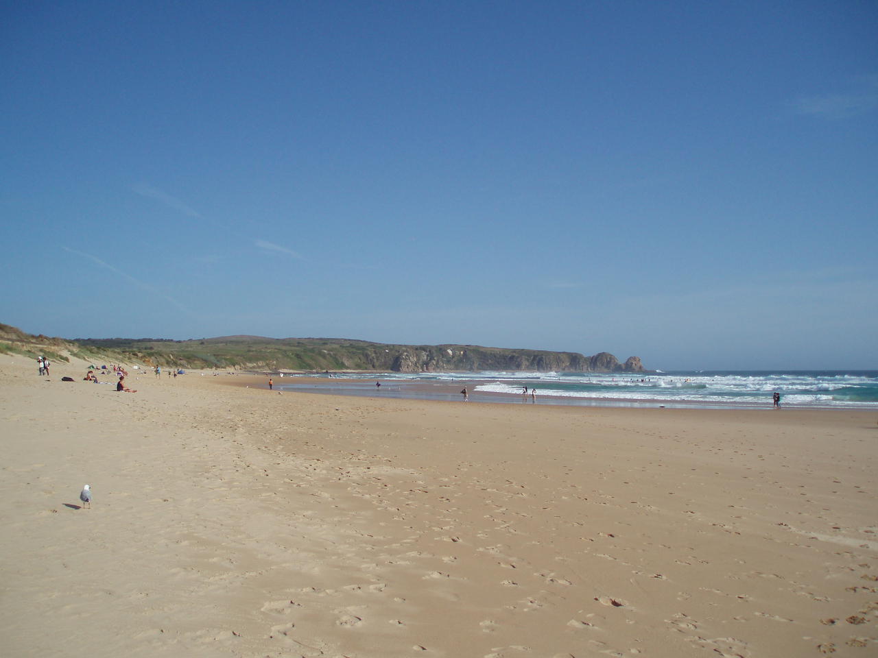 So wartete man also, und wartete und wartete und wartete... Und irgendwann zeigten sich tatsächlich ein paar kleine Punkte im Wasser. Allerdings haben Pinguine Angst vor Möwen, und da viele Möwen am Strand waren, schwammen sie immer wieder zurück ins Wasser, bevor sie sich endlich an Land trauten und so schnell sie konnten den Strand überquerten, um die sichere Vegetation zu erreichen. Bald schon kam dann das nächste Grüppchen.