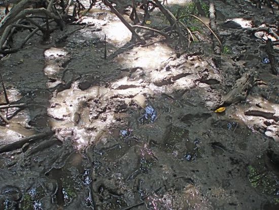 Die Wurzeln der Mangroven wachsen aus dem Schlamm heraus, da der Boden so sauerstoffarm ist