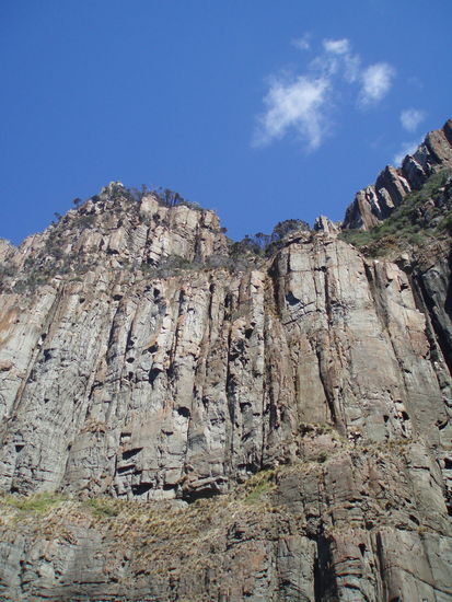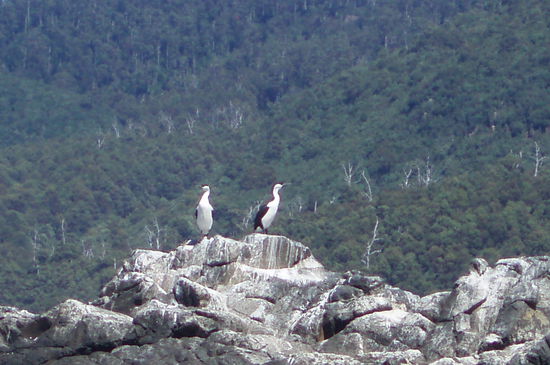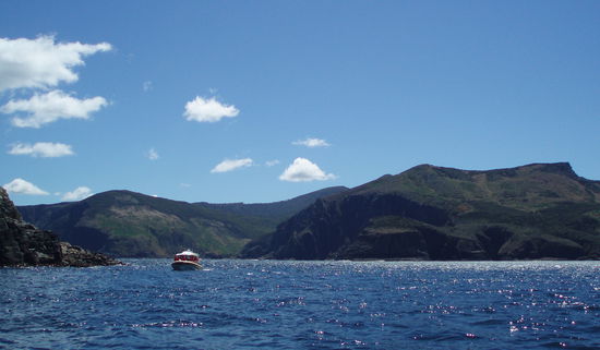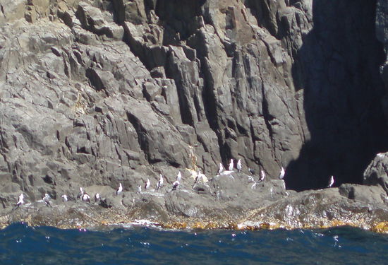 Nachdem wir in bodenlange, knallrote Anoraks gegen Wind und Spritzwasser gehüllt worden waren, brausten wir also an der Küste entlang, suchten nach Tieren, fuhren in Höhlen, die tief in den Klippen lagen usw. Wir sahen Seeadler, Scharen von Sturmtauchern und Kormoranen, und natürlich viele Möwen. Das Boot rauschte durchs Wasser und hielt immer wieder an besonderen Punkten, wo der Guide uns die beeindruckend hohen Klippen zeigte, uns auf besondere Pflanzen oder Vögel hinwies oder wir einfach den Blick auf die Küste genossen und Fotos machten. Einfach klasse!