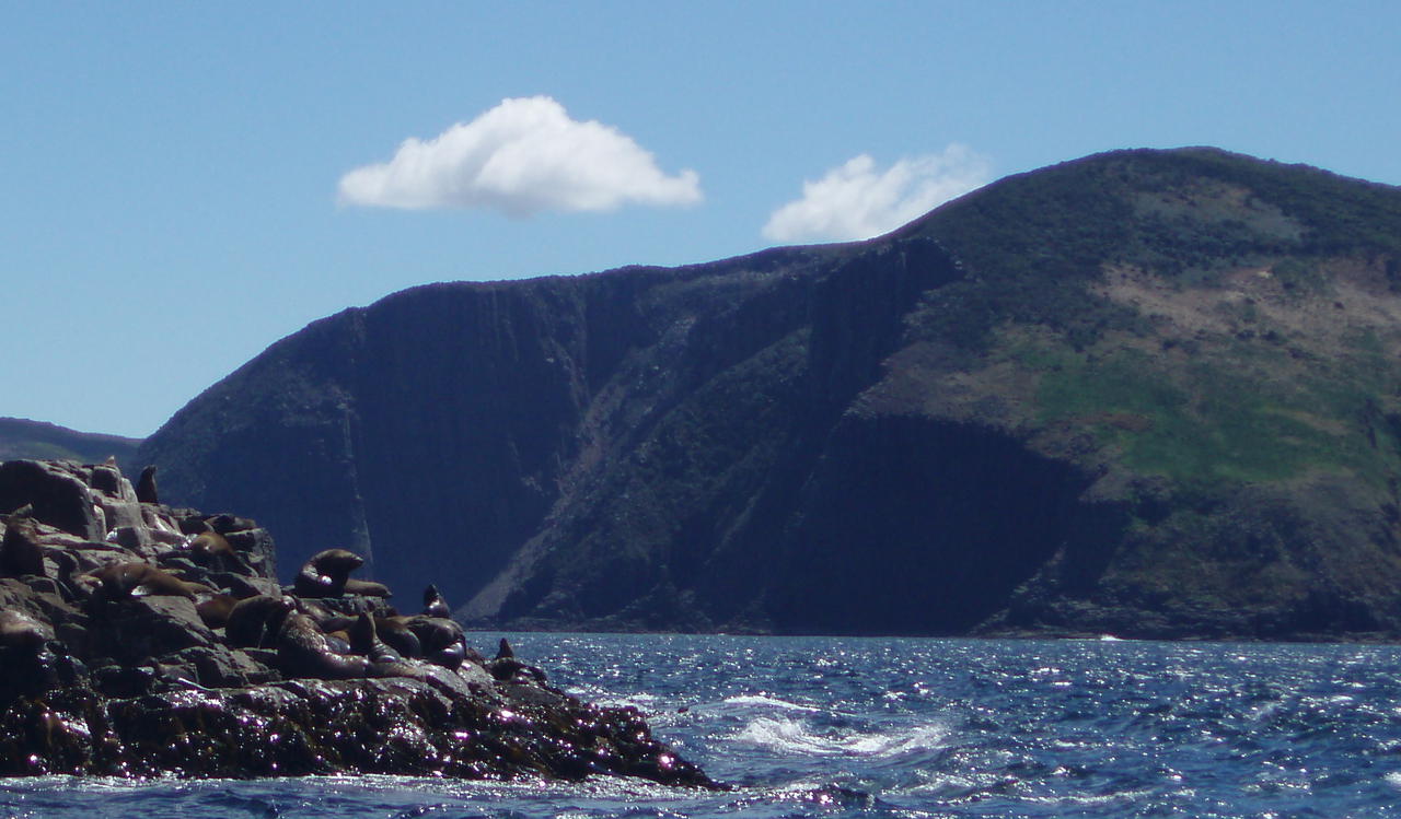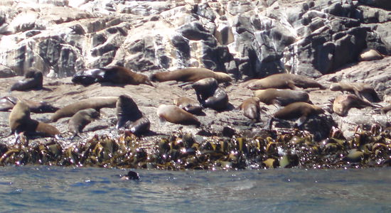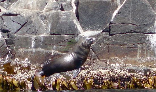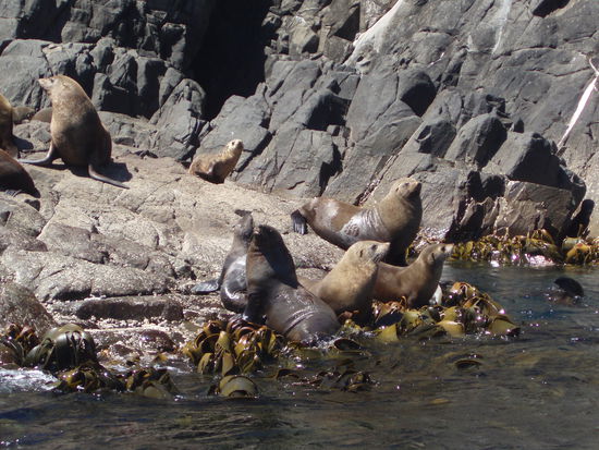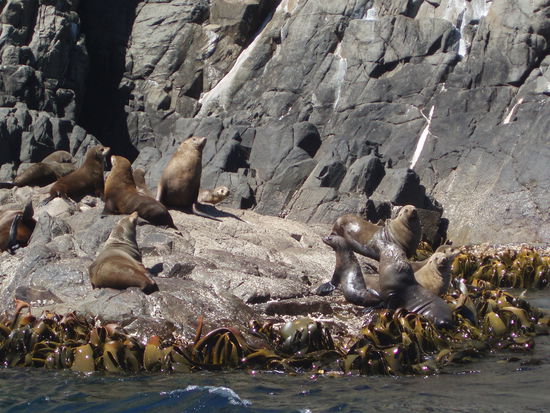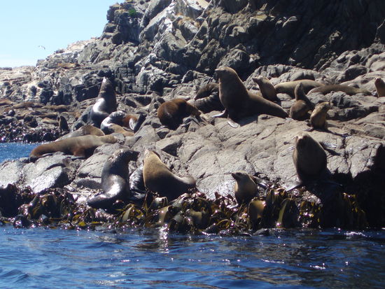 Der Höhepunkt der Tour war die große Pelzrobbenkolonie, die hier auf ein paar Felsen lebt. Wir verbrachten einige Zeit damit, langsam und ruhig um diese Felsen herumzufahren und die Tiere zu beobachten. Es war sehr interessant, denn diese Robbenart hatte ich vorher nicht in so großer Zahl und schon gar nicht so nah gesehen. Man konnte auch viele beobachten, die schwammen und im Wasser spielten, von den Felsen zum Fischen abtauchten, oder sich kleine Streitigkeiten lieferten. Und vor allem konnte man sie auch riechen! Der legendäre Gestank der Pelzrobben...