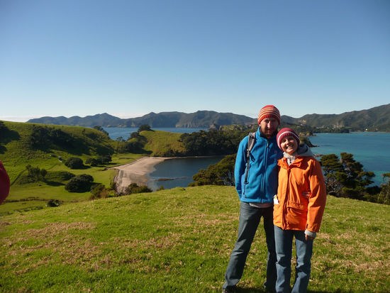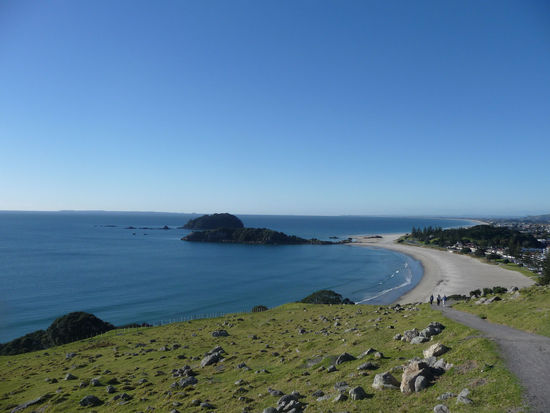 Nach weiteren 150km Fahrt Richtung Norden haben wir wieder eine vollkommen andere Landschaft... Statt Vulkane und brodelndes Wasser nun herrliche Strände bei der Bay of Plenty. Aber was sich nicht ändert ist das Wetter: Herrlicher Sonnenschein bei wolkenlosem Himmel. Deshalb geht's auch gleich in der Früh zu Fuß auf den Mt. Maunganui, der direkt hinter der Stadt Tauranga am Meer liegt. Und von dort oben wurden unsere kleinen Mühen (und Claudi's große Mühen, weil ich den steileren, dafür kürzeren Weg nach oben wählte ) belohnt und wir durften eine traumhafte Aussicht auf kleinere Inseln in Küstennähe, lang gezogene Sandstrände und auf die Stadt Tauranga genießen. Gegen Mittag wieder unten angekommen machten wir uns gleich auf den Weg auf die Coromandel Peninsula, auf der sich die "Hot Water Beach" und die "Cathedral Cove" befinden. Am Parkplatz zur "Cathedral Cove" trafen wir dann wieder zufälligerweise ein Ehepaar aus Karlsruhe, mit denen wir am vorherigen Tag am Lady-Knox-Geysir ins Gespräch gekommen waren. Von denen erfuhren wir, dass wir ein wenig zu spät am "Hot Water Beach" ankamen, denn nur bei Ebbe am Vormittag kann man an einem bestimmten Bereich kleine Löcher in den Sand buddeln und sich dann in das Wasser legen, dass dort sehr heiß ist, da sich in einigen Metern unter der Erde eine heiße Quelle/Stein befindet. Wieder was gelernt, doch dafür findet man nachmittags am leeren Strand sehr leicht verlorene Sonnenbrillen wieder.