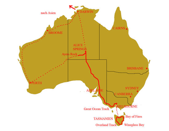 Als erstes geht es noch weiter Richtung Süden: Mit der Fähre wollen wir von Melbourne nach Tasmanien, um dort 2-3 Wochen zu verbringen und die Insel zu erkunden. Wenn es das Wetter zulässt würden wir gerne den Overland.Track gehen, eine sehr bekannte 7-Tages-Wanderung. Zusätzlich haben wir auch eine 2 oder 3 - Tages-Wanderung an der Wineglass-Bay ins Auge gefasst. Davor wollen wir auch einen kleinen Track bei den "Bay of Fires" gehen, welche Gegend laut "Lonely Planet" der beste Platz der Erde ist. Zurück auf dem Festland in Australien soll es dann über die "Great Ocian Road" nach Adelaide gehen. Bei der "Great Ocean Road" würde es eine sehr schöne, 7-Tägige Wanderung geben, die wir ins Auge gefasst haben, falls wir nach dem Overland-Track noch Lust haben und fit genug sind. Nach Adelaide soll es dann weiter in das "rote Zentrum" gehen, in das Outback. Dort ist natürlich das große Ziel Alice Springs, der "Ayers Rock" und die "Olgas". Wie es dann von dort weiter geht, da sind wir uns noch nicht ganz im Klaren und entscheiden es kurzfristig. Entweder geht es direkt die 2.000 km weiter Richtung Norden nach Darwin oder mit einem Umweg über die Westküste (Perth, Broome) nach Darwin. Wir werden sehen, wir wissen nur, dass wir nach Darwin kommen wollen, weil es von dort mit einem Schiff nach Asien (wahrscheinlich Indonesien) gehen soll.