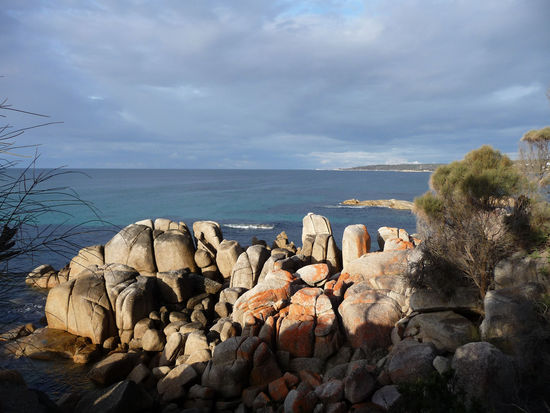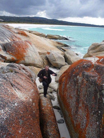 Bei bestem Wetter und wolkenlosem Tag standen Piet und ich fertig gepackt und bereit zum losmarschieren in der Küche, und warteten, bis unser Norweger endlich einmal einen Zeitungsbericht aus dem Jahre 2004 zu Ende gelesen hat und nach über einer halben Stunde aus dem Bett gekrochen kam um dann zu erfahren, dass der Bus nach Hobart vor 10 Minuten ging und bis Sonntag Vormittag kein Bus die Ortschaft verlässt. Im Informations-Center erfahren wir, dass in einer Ortschaft, die eine Autostunde entfernt liegt, ein Bus gegen Mittag geht. Um den Norweger endlich los zu werden beschlossen wir, den halben Tag zu verschenken, ihn dorthin zu fahren, wieder zurückzufahren und nur ein paar Stunden bei den Bay of Fires zu wandern. Vorbei an wundervollster Landschaft bei wundervollstem Wetter ging es mit unserem (wieder einmal) schlafenden Norweger nach Süden. Ich war so sauer auf ihn, und gegipfelt hat es dann, als wir ihn bei der Bushaltestelle abgesetzt haben: Kein Danke, kein "Tut mir Leid" oder sonstiges von ihm, nicht einmal einen Cent Benzingeld bekamen wir von ihm, obwohl er wusste, dass wir nur wegen ihm da runter fuhren. Aber nach einer kurzen Zeit war die Freude, ihn los zu sein größer. Zurück in St. Helens ging es mit dem Auto kurz an einen Strand, um im Sand 3 Kilometer zurückzulegen, doch nach 200 Metern war dann der Spaß vorbei: Die Kupplung ist durchgebrannt, und da standen wir, alleine mit einem kaputten Auto, bei schönstem Wetter, ohne Handyempfang. Ich machte mich auf den weg, in die nächste Ortschaft, um Hilfe zu holen. Doch gab es anfangs große Verständigungsprobleme am Telefon! Kleiner Tipp: Wenn man im Wörterbuch ein Wort wie Kupplung nachschlägt, nicht gleich das erstbeste Wort nehmen, sondern weiterlesen. Was interessiert es einem Abschleppdienst, wenn ich sage, dass unsere "Coupling" (Verkuppelung von Personen) im Auto am Strand nicht funktioniert? Es hat ziemlich lange gedauert, bis ich erstmal begriffen habe, dass das richtige Wort für die Kupplung im Auto "clutch" heißt. Noch länger hat es gedauert, bis der Abschlepper wusste, was ich eigentlich von ihm will. Nach einiger Zeit kam er dann, um festzustellen, dass wir nun in wirklich großen Schwierigkeiten sitzen, da er uns von dort nicht herausziehen kann, aber er kümmert sich darum. Als dann ein Ranger kam und uns mit seinem Traktor 200 Meter hinauszog und dafür 100 Euro verlangte, wussten wir schnell, dass das hier verdammt teuer werden kann. Ohne Handyempfang, ohne Internet in einem kleinen Ort und weit weg von der nächsten größeren Stadt (über 200 km) waren wir aufgeschmissen. Zum Glück haben wir mit unserem richtigen Abschlepper einen sehr netten Typen erwischt, der für uns auch einige Sachen organisiert hat. Und wir waren dadurch sehr schnell ein großes Gesprächsthema in dem kleinen Dorf, ziemlich schnell waren wir bekannt als die 2 Jungs mit dem kaputten Auto. Nächsten Tag fütterten wir vormittags fleißig die Telefonzelle mit Geld um zu erfahren, dass es hier in der Gegend nur eine Werkstatt gibt und vor Montag wir über Reparaturkosten nichts erfahren können. Also insgesamt 4 Tage in St. Helens, aber wir machten das Beste daraus. Samstags ging es dann hinaus zu den "Bay of Fires", und selten so eine spektakuläre Strand-Felsen-Landschaft gesehen wie dort. Einfach einmalig und absolut faszinierend.