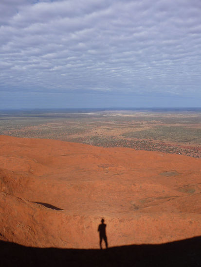 Eigentlich haben wir uns vorgenommen, auf den Berg (etwas mehr als 300m Höhe) nicht hinaufzusteigen und den Wunsch der Aborigines zu respektieren, doch wenn man davor steht juckt es schon einen sehr, und wenn man dann noch die "Autobahn" an Leuten sieht, die dort hinaufströmen, fällt (leider) die letzte Hemmung. Man darf den Berg rein rechtlich besteigen und es ist dort auch ein Weg mit Aufstiegshilfen ausgeschildert, doch für die Aborigines ist der Berg ein großes Heiligtum und diese bitten deshalb, den Berg nicht zu besteigen, auch weil es dort schon viele Unfälle, sogar Todesopfer gab, da viele Leute die Hitze (kein Schatten) und die Schwierigkeit unterschätzen. Schon auf den ersten Metern hinauf verwunderte uns nichts mehr: Wir waren die einzigen mit Bergschuhen (sogar Flip-Flops waren unterwegs) und etwas festere Leute, die schon mit einer 100-Meter-Wanderung Schwierigkeiten haben, kämpften sich den sehr steilen Aufstieg bei brutaler Hitze mit gerade einmal einer 0,33l Flasche hinauf. Kurz vorm Gipfel verging dann kurzzeitig auch uns der Spaß: Bei einem "Graben", bei dem es fünf Meter beinahe senkrecht runter und gegenüber wieder nach oben ging und den wir auf allen Vieren hochkraxelten, fühlte sich ein ca. 50jähriger Mann anscheinend im 2. Frühling und rannte die fünf Meter hinunter. Und man kennt es ja, wenn der Oberkörper schneller ist als die Beine. Sehr zu meiner Überraschung schaffte er es auch nach unten, doch war da noch der Gegenbuckel: Ihm zog es die Beine weg, er brachte die Hände nicht mehr rechtzeitig hoch, schlug mit dem Kopf auf dem Felsen auf, zappelte kurz und blieb bewusstlos auf der Seite liegen. Wir eilten sofort zu ihm und sahen nur Blut am Felsen hinunter fließen, welches irgendwo von seinem Kopf her kam. Nach kurzer zeit kamen noch zwei weitere Männer vorbei, und wir versuchten verzweifelt Hilfe zu rufen, doch kein Handy konnte eine Verbindung aufbauen. Nach ein paar Minuten kam der Mann dann Gott sei Dank wieder zu sich, und außer einer Platzwunde an der Stirn und einer offenen Nase hat ihm anscheinend nichts gefehlt. Aber da wird es einem schon anders, und aus diesen Gründen ist es leicht zu verstehen, weshalb die Besteigung angeblich ab nächstem Jahr verboten wird. Zwar ist sie nicht allzu schwierig, aber wird total unterschätzt. Die Sicht oben ist dann schon sehr toll: Außen herum nichts, man sieht nur die "Olgas" und den "Mt. Connor" aus der Ebene herausragen, und ansonsten nur Steppe. Aber auch die 10km Wanderung um den Berg herum, die wir mit Flo und Tina aus Deutschland (schönen Gruß auf diesem Wege zurück) gingen, ist sehr zum empfehlen und sehr abwechslungsreich: Höhlen, Löcher, Spalten, Malereien, Wasserfälle (meist ausgetrocknet), usw. gibt's dort zu sehen.