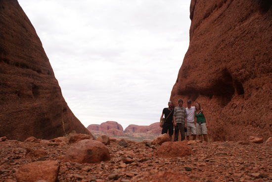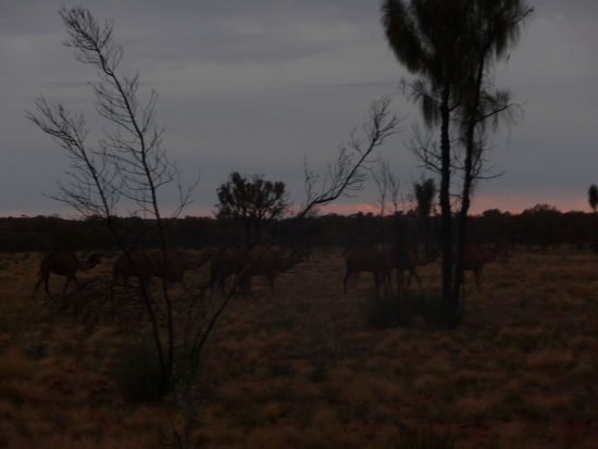 50 Kilometer weiter befinden sich die "Olgas", einer beeindruckenden Ansammlung von Monolithen, die mindestens genauso spektakulär wie der "Ayers Rock" sind, besonders die 8km lange Wanderung zwischen den Felsen hindurch, die wir wieder mit Flo und Tina unternahmen. Aber auch dort hatten wiederum Wolken etwas gegen einen rot-leuchtenden Sonnenuntergang. Beim Weg zurück zum Zeltplatz zog dann eine Herde wilder Kamele und Dromedare an der Straße vorbei, sehr eigenartig, wenn man die dann doch live an einem vorbeiziehen sieht.