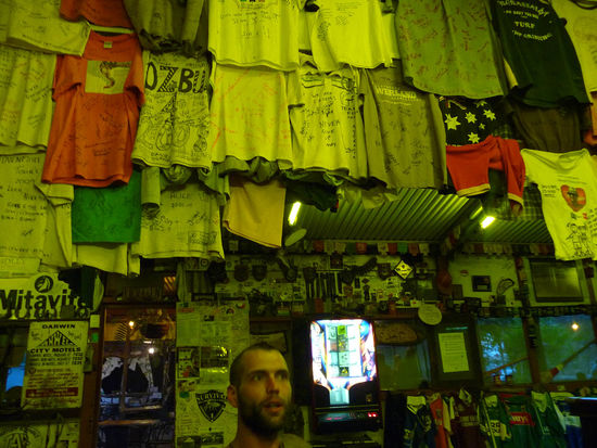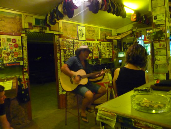 Und die Straße wurde noch öder und langweiliger, man fährt 20km, dann kommt eine kleine Kurve, dann wieder 20km gerade aus... Und links und rechts riesige Felder mit Termitenhügeln, sieht teilweise aus wie ein übergroßer Friedhof. Direkt am Highway kommt man nach einem Tag Fahrt an den "Devils Marbles", einem Felsenfeld, auf dem auf wundersamerweise riesige Steine übereinander gestapelt sind, vorbei. Einen Tagestrip weiter erreicht man die Ortschaft "Daly Waters", welche durch seinen Pub sehr bekannt ist. Der Pub hat die älteste Ausschanklizenz im Northern Territory und ist wegen seiner Dekoration sehr bekannt: Wie in der Kneipe in "William Creek" hängen überall Unterwäsche, Bilder, Flaggen, Ausweise, Abzeichen, usw. herum, man fühlt sich sofort wohl und wir hatten einen sehr netten Abend dort: aus einem Bier wurde ein wenig mehr, ein Australischer Countrysänger freute sich so, dass ihm ein paar Leute bei seinem Gitarrenspiel zuhörten, dass er gleich eine komplette Runde schmiss, ...
