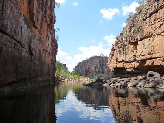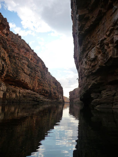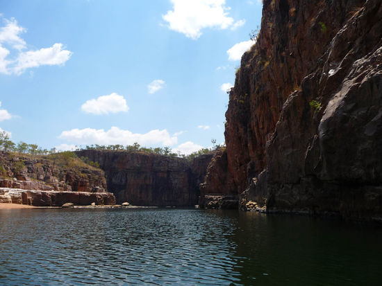 In Katherine hieß es erstmals sich etwas an die Hitze zu gewöhnen. Brutal heiß und schwül, da musste sich erstmal der Körper umstellen, vor einigen Wochen noch im Schnee gewandert und nun Temperaturen um 40°C. Wegen dieser Hitze entschieden wir uns gegen den vorgehabten "Jatbula-Track" (5-Tageswanderung durch den "Nitmiluk-Nationalpark") und mieteten uns stattdessen ein Kanu und machten damit eine Zwei-Tagestour durch die "Katherine Gorges", einem Flusslauf durch viele Schluchten hindurch. Als wir dann mal endlich unsere Campingerlaubnis vom Ranger erhielten, konnten wir uns dann endlich bei einer brutalen Hitze auf den Weg machen. Nach ca. 45 Minuten paddeln ließen wir die erste Schlucht und auch die meisten Tagesausflügler hinter uns, nach der 3. Schlucht war dann absolute Stille angesagt. Bei einer Sandbank am Anfang der 5. Schlucht schmissen wir unser Zelt hinaus und machten uns auf in die absolut spektakuläre 5. Schlucht hinein. Links und rechts hohe und steile Felswände, und wir paddeln hindurch, einfach herrlich, nur die Fische weigerten sich anzubeißen, so gabs abends "nur" Nudeln über dem Feuer. Nächsten Tag paddelten wir dann ein wenig Sonnenbrand geplagt, ohne leider einem Krokodil begegnet zu sein, schön geschmeidig zurück nach Katherine. Es gibt in Australien zwei Sorten von Krokodile, das Salzwasserkrokodil (sehr gefährlich) und das Süßwasserkrokodil (ungefährlich, sagen die jedenfalls), und jene Süßwasserkrokodile sind dort auch zu Hause. Aber außer einer riesigen Krokodilfalle und einigen Schildern keine Spur.