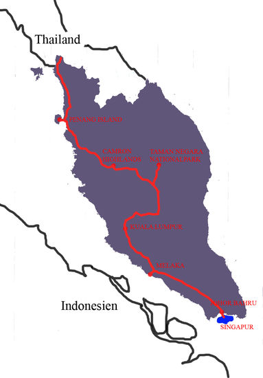 Unsere Hauptziele sind die Kleinstadt "Melaka", welches früher eine sehr wichtige Hafenstadt gewesen ist und nach diesem Ort wurde auch die Meeresenge "Straße von Malakka" benannt. Darauf wollen wir über die Hauptstadt "Kuala Lumpur" mit den "Petronas Towers" zu dem "Taman Negara Nationalpark" gelangen, welcher einer der ältesten Urwälder der Erde sein soll. Über die "Cameron Highlands" (Teeplantagen) soll es zur Insel "Penang" gehen und von dort weiter nach Norden und nach Thailand hinein.