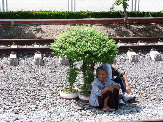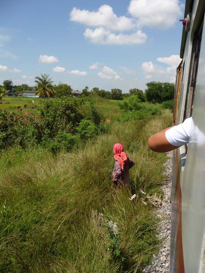 Mit dem Zug ging es hinaus aus Bangkok, nach "Ayutthaya", der früheren Hauptstadt Thailands. Für die Fahrt, die wegen einiger unplanmäßiger Stopps (z.B. Kühe auf den Gleisen) zwei Stunden statt einer gedauert hat, wählten wir das billigste Ticket: 3. Klasse für 70 Cent. Zwar hatte unser Waggon nicht die befürchteten, aber auch gewünschten Holzbänke, aber bewegen durfte man sich trotzdem nicht, da sonst die Sitze in sich zusammenkrachten. Aber von der "Holzklassen-Romantik", wie man es von Asien hört und sich vorstellt, keine Spur: Niemand lag auf dem Flur, keine Hühner hüpften herum, keine Bretterverschläge als Wände, kein stinkendes, trinkendes Volk. In "Ayutthaya" angekommen hieß es dann den Zug nach Thailändischer Art zu verlassen: Ohne Bahnsteig, mitten auf die Gleise. Als unsere Rucksäcke aus dem Fenster heraus gereicht wurden, störte die Idylle nur ein ständiges Hupen eines anderen Zuges, der auf dem Gleis, auf dem wir standen, uns entgegenkam.