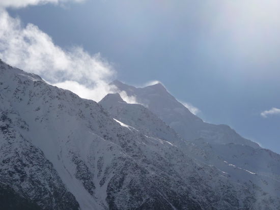 Nächsten Tag hatten wir dann mehr Gück... es regnete nur bis 8.00 Uhr und der Himmel begann sich aufzuklaren. Im Tal des Mount Cook haben wir dann unsere erste größere Wanderung unternommen. Und am Ende unserer Tour hattn wir dann auch endlich Glück und der Mount Cook hat sich uns für wenige Minuten gezeigt.