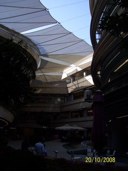 Beeindruckend ist die Architektur des Gebäudes mit vielen Bögen und Rundungen. Außerdem befinden sich ebenerdig gemütliche Cafés umgeben von Brunnen und ein bisschen Grün. Hier kann man sich ganz entspannt von den Preisschocks erholen.