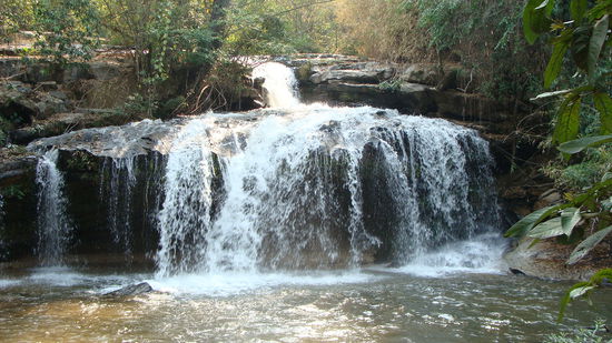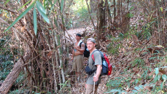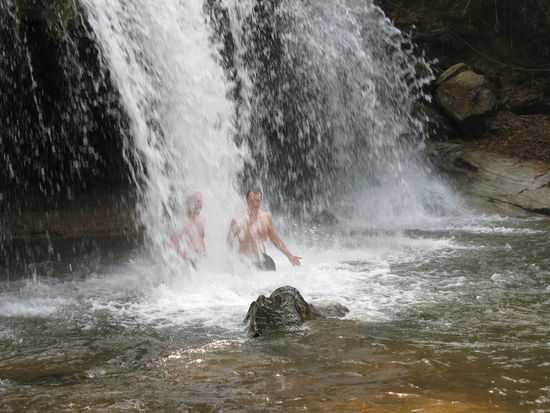 Nach einem kleinen Imbiss, ging's per Pedes für ca. 3 Std. zum ersten Village. Der Weg dorthin führte querfeldein durch's Unterholz, später an einem Fluss vorbei und schließlich zu einem idyllischem Wasserfall. Dieser bot sich natürlich an, den reichlich vorhandenen Schweiß von der Haut su spühlen.