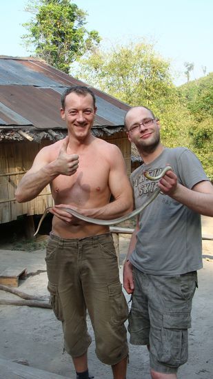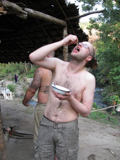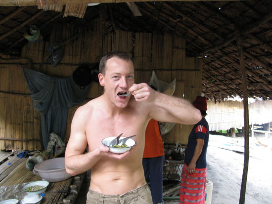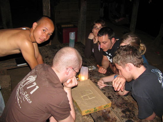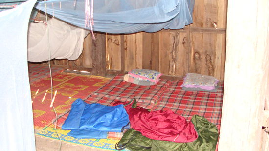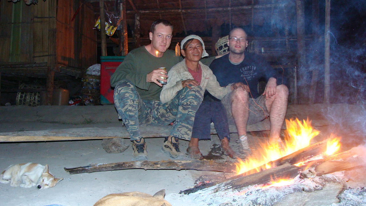 Kurz darauf erreichten wir das mitten im Dschungel gelegene Dorf. Während wir ein wenig chillten, bereiteten unsere Gastgeber das Abendmahl vor. Anschließend saßen wir in geselliger Runde zusammen und versuchten einige von unserem Guide gestellte Stöckchenschieberätsel zu lösen. Nach einiger Zeit gingen die Ersten ins Bett und wir sahen uns gezwungen als einzige Biertrinker weiterhin die vorhandenen Reserven zu minimieren. Unser Schlafgemach (ein Saal für alle) bestand komplett aus Bambus und ein par Decken, die als Unterlage und Schutz gegen die Kälte der Nacht dienen sollten. Da es doch kälter wurde als erwartet und unsere zarten Körper nicht für solche harten Bodenbeschaffenheiten ausgelegt sind, war auch diese Nacht alles andere als erholsam.