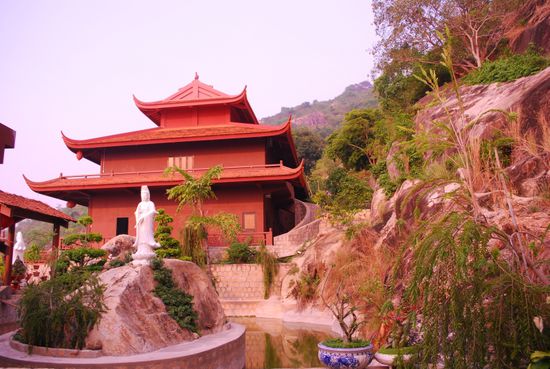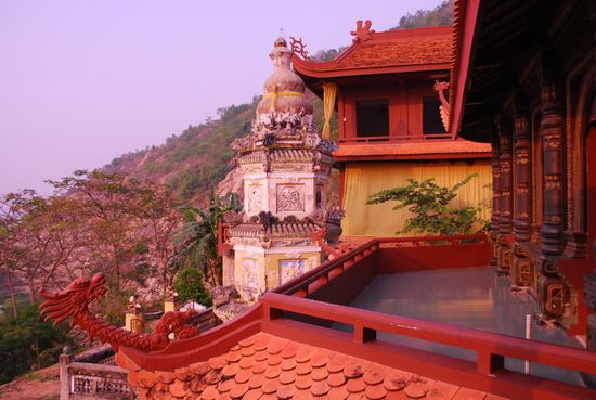 Gegen Mittag sind wir zurück und steigen ziemlich fertig in den Bus, der uns nach Chau Doc an die kambodschanische Grenze bringt. Am frühen Abend kommen wir an und gehen noch zum heiligen Berg Sam, an dem sich auf halber Höhe ein wunderschönes Kloster befindet, in dem die Mönche eine kleine Pagode in den Fels gehauen haben - die Caved Pagoda. Die ganze Anlage liegt einfach traumhaft schön mit Blick ueber einen Teil des Deltas bis hinein nach Kambodscha.