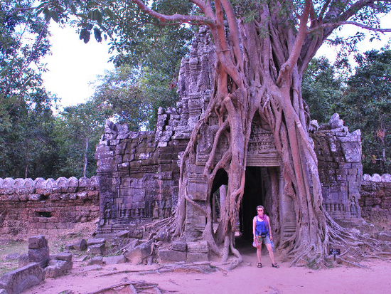 Quer durch Angkor Thom (das sind immerhin 3km), vorbei an Bayon und den Terraces of the Elephants fahren wir nach dem Frühstueck zum Preah Khan, einem Tempel dessen Mauern und Gebäude ganz ähnlich wie Ta Prohm teilweise von den Wurzeln riesiger Urwaldriesen umklammert und scheinbar festgehalten werden.