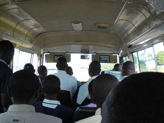Plötzlich geht alles ganz schnell: Ein junger Mann kommt auf uns zugestürmt und fordert uns auf einzusteigen. Wir springen auf, doch im gleichen Moment wird mir klar, dass alle Sitze der beiden Reihen besetzt sind. Mein Gefährte bleibt unberührt und klappt plötzlich einen weiteren Sitzplatz aus und sitzt nun zwischen beiden Reihen, so dass es keinen Zwischengang mehr gibt. Verblüfft mache ich es Ihm in der Reihe davor nach. Wie Sardinen sitzen wir eng aneinander gedrückt, 20 Schwarze und wir beide.