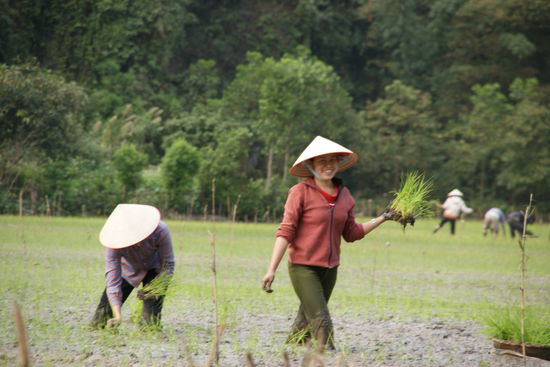 Das Hotel aus dem Reiseführer hörte sich vielversprechend an (Thanh Thuy's, 15$, da gut gehandelt). Der Besitzer hat uns eine Tour in die "Trockene Halong Bucht" angeboten (8$, Eintrittspreis für das Bootfahren zahlt man extra). So sind wir am nächsten Tag mutig mit dem Motoradtaxi mitgefahren ... dann mit dem Boot durch die Karstfelsen, an Reisfeldern vorbei ... die Frauen arbeiten sehr hart, stehen im Schlamm und bearbeiten ihre Reisfelder. Dann ging es weiter zu einer Aussichtsmöglichkeit (über 600 Stufen; lohnt sich, der Ausblick ist wirklich schön, oben auf dem Berg ist ein Drache zu sehen).