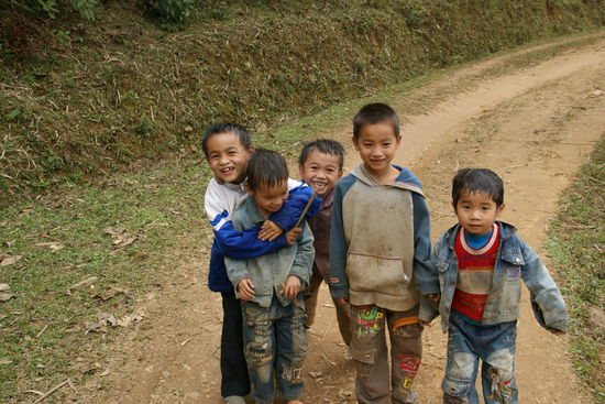 Morgens um 9.00 Uhr starteten wir mit unserem Guide in den "Dschungel" (Regenwald, Bambuswälder, Reisterrassen), vorbei an Hütten, Wasserbüffeln, Rindern, unzähligen Hühnern und Enten ... der Wald wurde dann immer dichter, schöne große Schmetterlinge tanzen in der Sonne und jedes Mal, wenn man einem Dorf näherkommt, rannten uns die Kinder entgegen und riefen "Hello".