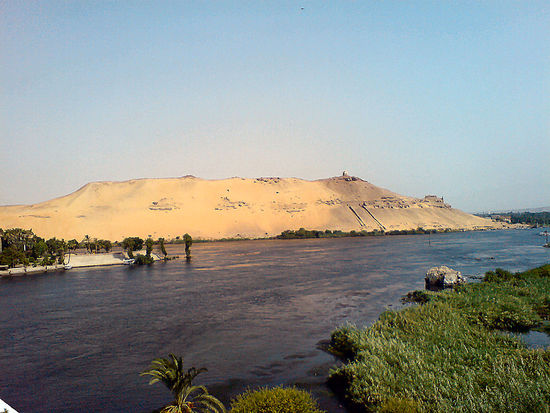 Erst am nächsten Morgen sehe ich, wie toll der Blick vom Balkon aus dem vierten Stock wirklich ist. Rechts der Nil und die Stadt, links der Nil und gleich nach einem ganz schmalen Grünstreifen steigt ein Sandhügel steil in die Wüste an.