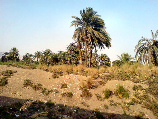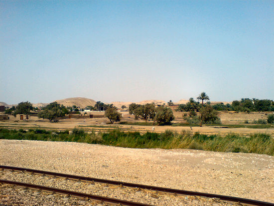 Der Bahnsteig füllt sich langsam mit Reisenden. Was bei uns undenkbar ist, ist hier selbstverständlich. Die Gleise sind mit Müll übersät, die Leute laufen einfach über die Schienen, statt die hierfür vorgesehenen Unterführungen zu benutzen, oder springen auf schon fahrende Züge auf. Dann kommt auch unser Zug mit quietschenden Bremsen zum stehen. Die Wagen sind reif für das Eisenbahnmuseum, hätte nur noch gefehlt, dass eine alte Dampflok vorgespannt wäre. Irgendetwas stinkt in dem Wagen, oder zieht von draußen rein, aber zum Glück verfliegt sich das schnell. Pünktlich verlassen wir den Bahnhof. Klimaanlage gibt es nicht, dafür bleiben Fenster und Türen geöffnet, was für einen angenehmen Fahrtwind, aber auch für das lärmende Geratter der Fahrgeräusche sorgt. Immer wieder lehnen sich Fahrgäste mit wehenden Kleidern weit zur geöffneten Tür hinaus. Bald kommen zwei Schaffner und verkaufen Fahrkarten, sofern man noch keine hat. 13 Pfund kostet die Fahrt nach Luxor. Bahnhöfe von Orten mit mir unbekannten Namen ziehen am Fenster vorbei. In Kom Ombu, Edfu und Esna hält der Zug kurz an. Je weiter wir nach Norden kommen, desto breiter wird der Grünstreifen am Nil. Palmen und Felder breiten sich links und rechts neben der Strecke aus. Alle möglichen Südfrüchte gedeihen hier im Zusammenspiel der Sonne und des Nilwassers. Ländliche Szenen spielen sich draußen ab. Häufig dienen noch Esel als Last- oder Zugtiere. Nach gut drei Stunden erreichen wir Luxor. Wurde auch Zeit, besonders bequem waren die Sitze nicht. Nur zu gut, dass ich von Cairo nach Assuan geflogen bin.