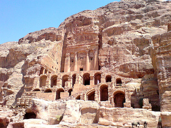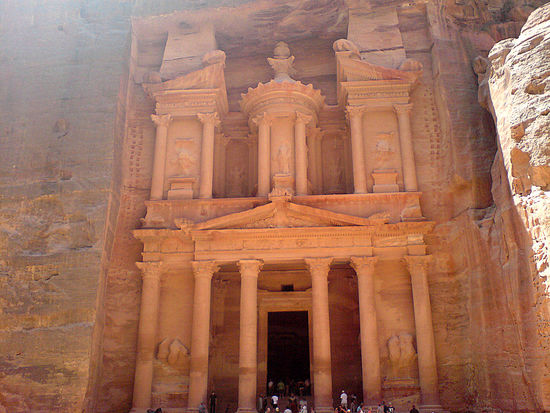 Das "Khazne-al-Firaun", das "Schatzhaus des Pharao", grüßt durch das schmale Ende der Schlucht. Es ist das wohl bekannteste Bauwerk Petras und misst fast 40 Meter in die Höhe und 25 in die Breite. Es ist im helenistischen Stil erbaut und diente als Felsengrab. Man vermutet, dass der Nabatäerkönig Aretas IV , der im 1.Jh. v. Chr. regierte, darin seine ewige Ruhe gefunden hat.
