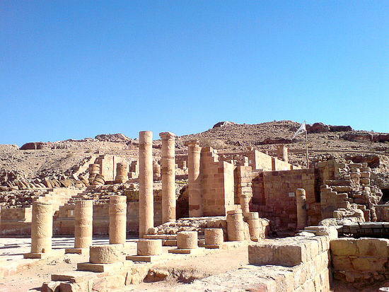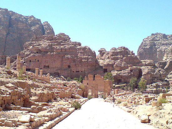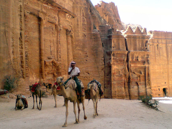 Majestätisch liegen zwei bunt geschmückte Kamele, wie Schiffe im Sand und warten auf Reitgäste. Das "Palastgrab", die größte Anlage in Petra, das "Korinthische Grab", das "Soldatengrab" und das "Urnengrab" aus dem 2. oder 3. Jahrhundert n. Chr. zählen zu den 13 Gräbern, der Königswand. Sie weisen sowohl römische, nabatäische als auch griechische Baustile auf. Der Ausstattung und Größe nach zu urteilen deuteten die Forscher sie als Königsgräber. Das einstige Stadtzentrum wird durch die Säulenstraße markiert. Petra verfügt auch über ein römisches Theater, aus dem 1. Jh, indem 5000 Menschen Platz fanden. Das Museum lassen wir links liegen und gehen den schmalen, steinigen Pfad, der leider etwas durch Eselsdreck verunreinigt ist, weiter bergauf. Von weiter oben hat man einen tollen Blick hinunter auf den Platz, auf dem sich winzig die Touristen und einige Kamele tummeln. Dahinter die Säulenstraße und in der Ferne die Silhouette der Felsengräber. Wir gehen weiter und nicht selten kommen freundliche Einheimische auf ihren Eseln geritten und sind dabei nicht gerade langsam. Der kleinste Fehltritt könnte einen Sturz in den tiefen Abgrund, der sich gähnend neben uns auftut, und somit ein jähes Ende der Reittour bedeuten. Eine Echsenart kauert auf einem Stein und genießt die heiße Sonne. Sicher hat sie längst bemerkt, dass sie beobachtet wird.