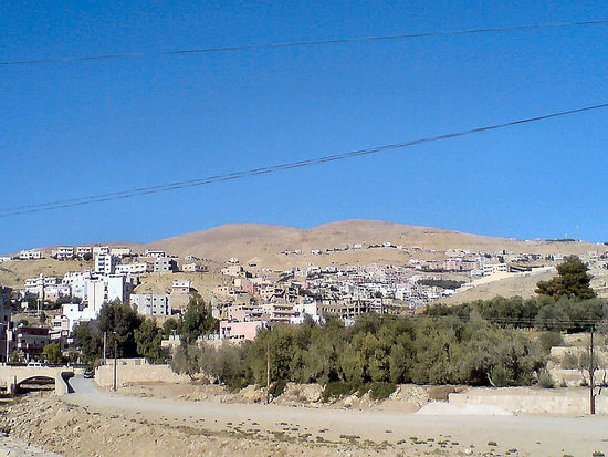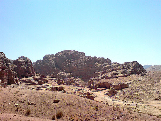 Die Sonne lacht wie gewohnt und gleich in der Früh hat es über 30 Grad. Ich nehme einen Bus Richtung Petra, der alten Nabatäer Stadt nahe Wadi Musa. Gleich hinter Aqaba führt die Straße steil hinauf in die Berge. Mit rotem Sand kündigen sich rechter Hand die Vorboten des bekannten Wadi Rum an, welchem ich auch noch einen Besuch abstatten will. Gegen Mittag erreichen wir Wadi Musa, eine kleine Stadt mitten in den kargen Bergen mit zahlreichen engen Straßen, die so steil sind, dass die PS-schwachen Autos nur schwer hinauf kommen. Ein englisches Paar und ein südländischer Jugendlicher, der aber kein Araber zu sein scheint, steigen mit mir aus dem Bus. Zufällig nehmen wir zusammen ein Taxi. Die Engländer wollen zu einem Hotel und der Junge will wie ich nach Petra. "Wo wollt Ihr übernachten?" fragt uns der Taxifahrer,"der letzte Bus nach Aqaba fährt um zwei, bis da seht ihr gar nichts von Petra, es ist viel zu groß." Er bietet uns an, uns für 45 JD zurück nach Aqaba zu bringen.