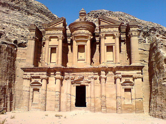 Am Ende des Weges, außerhalb der eigentlichen Stadt, befindet sich das Felsengrab "Ed-Deir", das Kloster. Diese Namensgebung ist den Mönchen zu verdanken, die sich im Mittelalter hier niedergelassen hatten. Seine Größe mit 40 Metern Höhe und 47 Metern Breite ist beeindruckend. Ein kleiner Kiosk mit erfrischenden Getränken und Blick auf das schöne Bauwerk lädt zum Verweilen und ausruhen ein. Der Reiseführer verrät uns, dass wir ein fast zehn Kilometer langen Fußmarsch hinter uns und natürlich ebenso viel noch vor uns haben. Der atemberaubenden Schönheit der Stadt und der umliegenden Landschaft wegen, kam uns das gar nicht so vor. Trotzdem scheint der Rückweg noch kürzer, da die vielen Fotopausen nun wegfallen. Immer wieder stehen Beduinenfamilien am Wegrand und wollen ihre Souveniers verkaufen, sind aber nicht aufdringlich.
