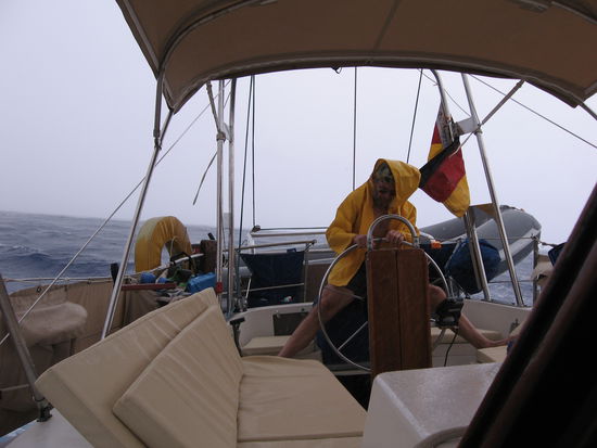 Der Anker hat nun richtig was auszuhalten, denn es kommt ein Schauer mit ungeheuren Wassermassen, wir sehen die Nachbarboote nicht mehr und haben den Eindruck, als drehe der Wind und drücke uns näher an den Strand. Sigi nutzt die Gelegenheit zum Sammeln von Brauchwasser, das er vom Deck gleich in seine Brauchwassertanks umleiten kann.