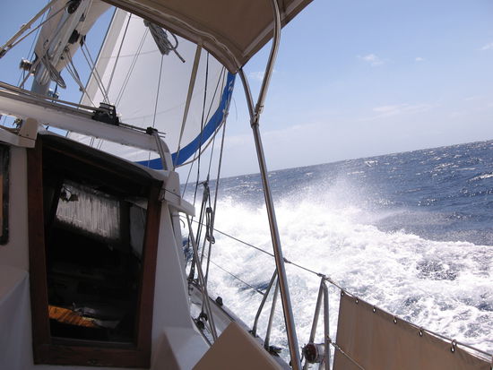 Dann endlich können wir den Kurs halten, und mit einem kleinen Schrick in den Schoten preschen wir voran, ein feuchtes Segeln, das uns verbliebenen dreien einen höllischen Spaß macht, zumal die Sonne dazu scheint. Wolfgang wird in seiner Koje eingewiegt und scheint irgendwann auch mal schlafen zu können. Vom Skipper und seiner Frau ist nichts zu sehen, laß die drei Verrückten doch ihren Spaß haben!
