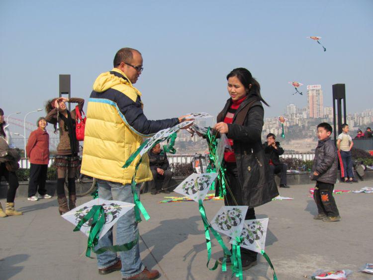 Deshalb kauft Lin Na 30 aneinander gereihte Drachen mit Pandabären drauf und es kann losgehen. Schritt 1: erst mal alles entknoten