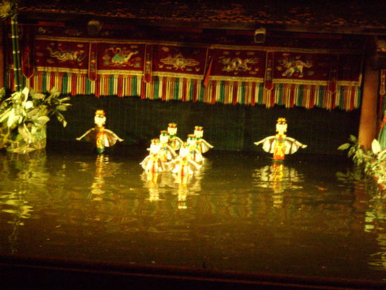 Nun ging es noch einmal durch die Altstadt zu Fuß, wo wir die ersten Versuche der Überquerung einer Straße starteten und uns mit dem Augenkontakt übten und der Empfehlung von unserem Reiseleiter Tai, immer langsam vorwärts gehen und nie zurück bzw. niemals stehen bleiben. Und siehe da, der Verkehr floss wie ein Wunder um einen herum und alle kamen unbeschadet auf der anderen Straßenseite an. Den Abschluss der Tages bildete dann das Wasserpuppentheater, wo die Akteure im hüfthohen Wasser stehen und die Puppen mittels Stäbe auf der Wasserfläche bewegt werden. Die Inhalte der Stücke sind immer vietnamesische Lebensweisen und sie werden mit einheimischer Musik und Gesang dargeboten.