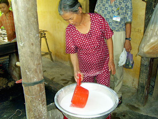 Wir sehen eine Bootswerft, wo alles Handmade ist und wandern weiter durch das Dorf zu einer Familie, welche Reisblätter auf ganz traditionelle Weise herstellt. Bei den mindestens 30 Grad im Schatten steht im Hof des Hauses ein Ofen und dort köchelt ein Sud dahin, aus welchem dann die Reisblätter hergestellt werden. Dann kommen die dünnen Fladen in die Sonne zum Trocknen auf ein Gestell und anschließend röstet die Oma des Hauses die getrockneten Fladen auf einem kleinen offenen Feuer und siehe da, leckere und kalorienarme Chips sind entstanden.