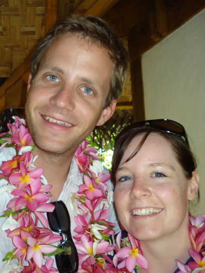 Bei der sehr lehrreichen Cocunut-Show von David (unserem Gaertner) am Nachmittag erfuhren wir, dass gleich 4 andere Paare die selbe Island Night fuer den Abend gebucht hatten. So trafen wir uns vorab noch auf einen Drink an der Hotelbar und lernten unsere "Nachbarn" ein bisschen besser kennen. Es war der erste Abend seit wir unterwegs waren, an dem wir uns mal richtig lange mit anderen Leuten unterhalten haben. War echt ganz nett! Uebrigens kann man hier noch anfuehren, dass wir erst uebrrascht waren, dass die meisten der 8 Villas mit Paerchen in unserem Alter besetzt waren, aber da dies der perfekte Honeymoon-Ort ist, war das eigentlich nicht mehr so erstaunlich. Im Tamanu-Beach, wo die Island Night stattfand, wurden wir zusammen mit dem Paerchen aus Madrid an einen Tisch gesetzt. Das war ein guter Zufall, denn wir hatten einen sehr lustigen Abend. Nach dem Essen ging die Show los. Mit Trommeln, Gesang und Tanz wurden wir etwas in die Kultur der Cook Island Maoris eingefuehrt. Man koennte leicht annehmen, dass diese Auffuehrungen in erster Linie der Touristen wegen gemacht werden. Das ist aber nicht so. Es gibt scheinbar sogar richtige Tanzcontest und diese Taenze sind den "Cookies" sehr wichtig. Am Ende wurde dann das Publikum sogar aufgefordert, mit zu machen. Jeder Taenzer und jede Taenzerin suchte sich im Publikum einen Tanzpartner. Von unserer Truppe erwischte es nur eineN... Wen wohl? Zu allem "Uebel" musste dann auch noch jeder alleine zeigen, was er gelernt hatte und Till war der erste in der Reihe. Videos gibt es nur auf Anfrage und gegen Gebuehr zu sehen...