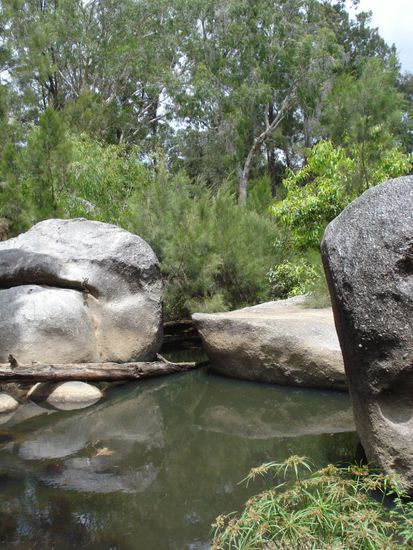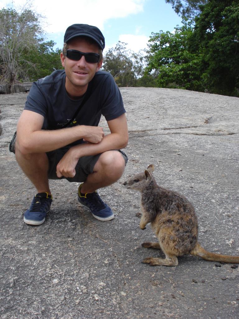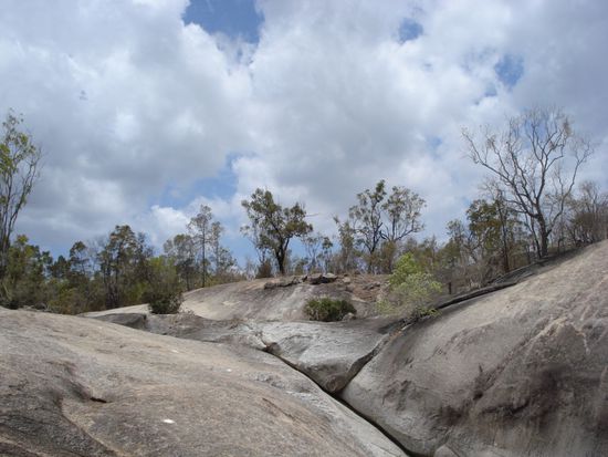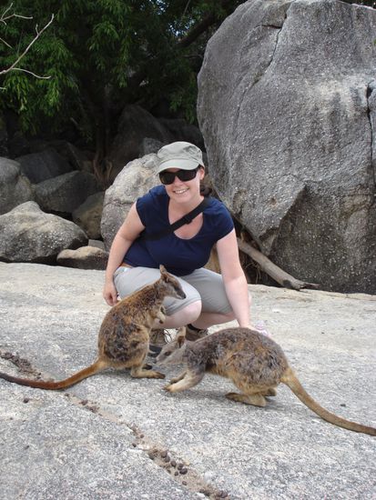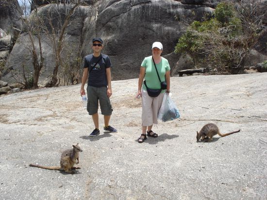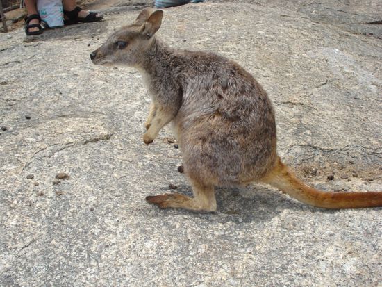 In Cairns waren wir ja schon, also haben wir das mal grossraeumig umfahren. Wir machten einen Abstecher in die Atherton Tablelands westlich von Cairns etwas von der Kueste weg. Nachdem sich die Krokodile vor uns versteckt hatten wollten wir an diesem Tag etwas mehr "Wildlife" sehen. Unser erster Stop war Granite Gorge bei Mareeba. Dort hat Regula schon bei ihrer letzten Australienreise die Rockwallabies besucht. Diese leben dort zwar wild, sind aber sehr zahm (nicht zuletzt deshalb, weil sie auch von den Besuchern gefuettert werden..).
