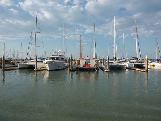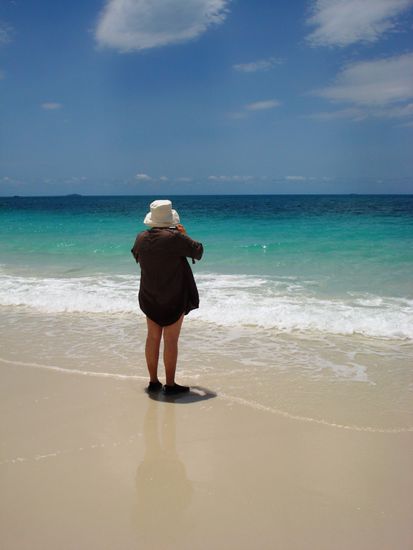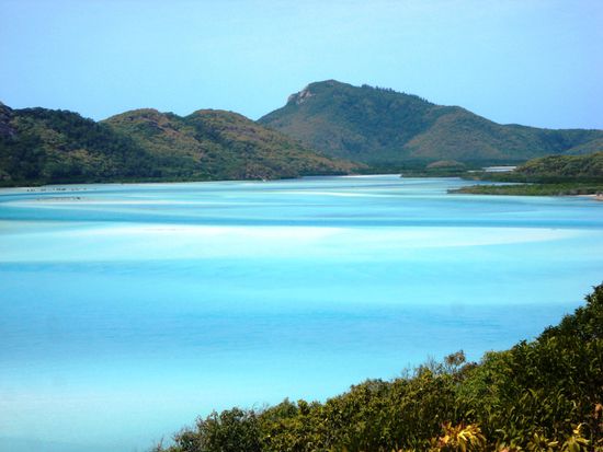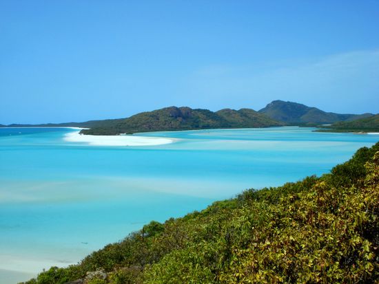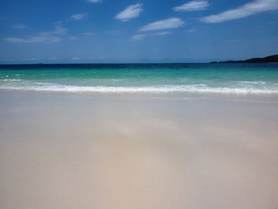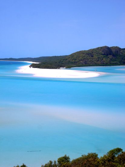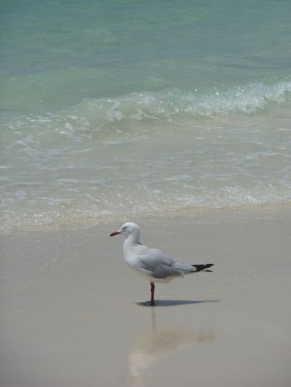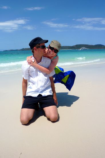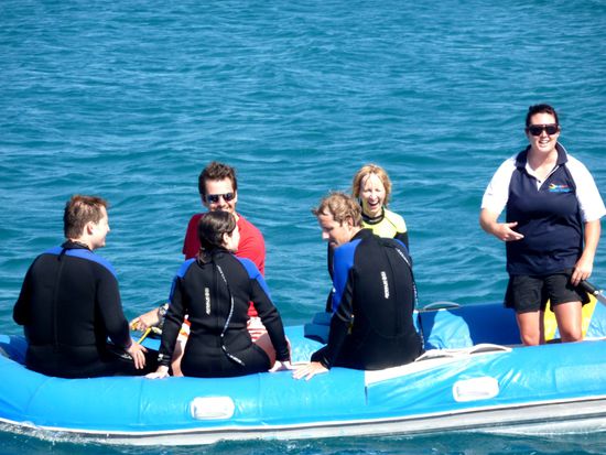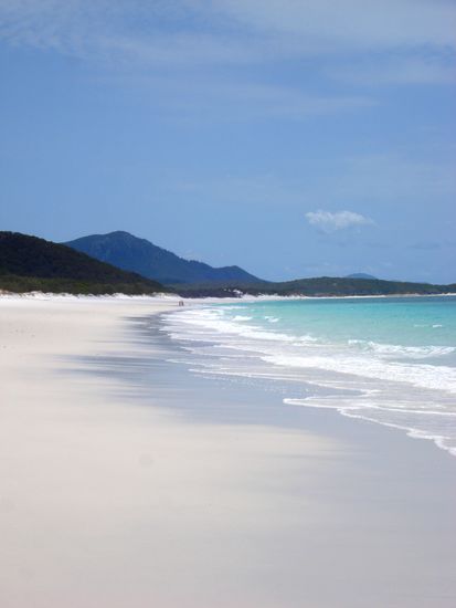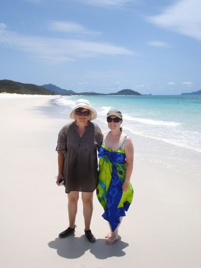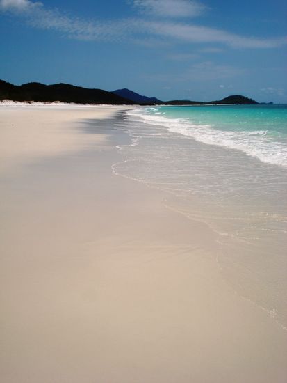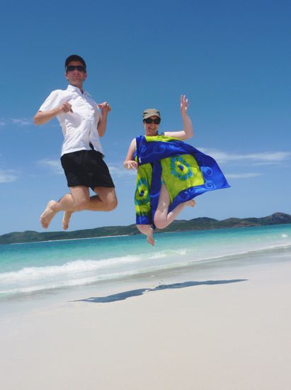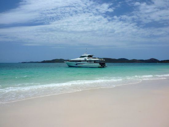 Vorsichtshalber kauften wir uns in Airlie Beach vor dem Ausflug zum Whitehaven Beach neue Tabletten gegen Seekrankheit und nahmen rechtzeitig die erste Dosis. Das Wetter sah schoen aus und wir redeten uns ein, dass das Meer sicher ruhiger sein wuerde als beim Ausflug zum Great Barrier Reef in Cairns, da es weniger windete und das Meer um die Inseln etwas geschuetzter war. Dass der Fahrer des Pickup's gesagt hat, es sei heute wieder recht windig draussen, haben wir gekonnt ueberhoert. Doch beim Briefing auf dem Boot konnten wir nicht mehr weghoeren, als erwaehnt wurde, es werde ziemlich schaukeln. Und das tat es dann auch! Wir setzten uns nach draussen und da wurde es etwas besser. Wir kamen alle drei bei bester Laune beim ersten Stopp an und auch spaeter machte uns die schauklige Fahrt nichts mehr aus. Sind wir zu Wasserratten mutiert oder waren einfach nur die neuen Tabletten wirkungsvoller?