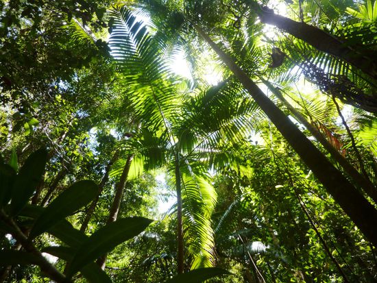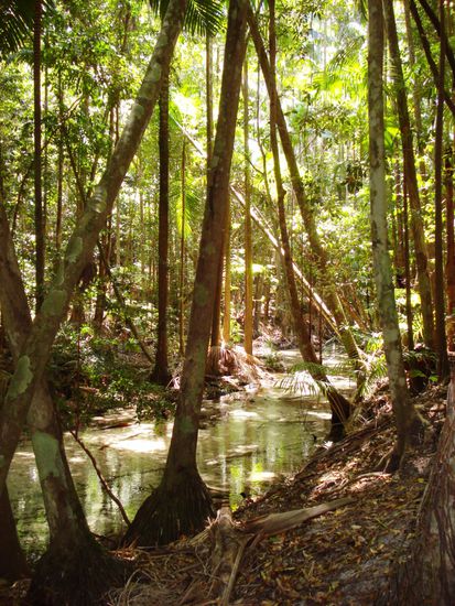 Fraser Island erreicht man mit einer Faehre vom Festland aus. Auf der Insel wurden wir vom Ranger Graham mit seinem 4WD-Truck-Bus-Mobil abgeholt (Tamara, es ist kein Witz, Graham war derselbe wie vor 7 Jahren! Zufaelle gibts . Er war unser Fahrer und Guide fuer die naechsten zwei Tage. Schon kurz nach dem einsteigen in den Bus wurden wir von ihm darauf aufmerksam gemacht, dass wir uns bei jeder Fahrt zwingend anschnallen muessen ... 100m spaeter wusste wir weshalb! Die Sandpisten auf der Insel sind wirklich extrem holprig und ohne Sicherheitsgurt koennte man sich bei der Fahrt nicht auf den Sitzen halten . Als erstes starteten wir von der Mitte der Insel einen Walk entlang eines wunderschoenen Creeks.