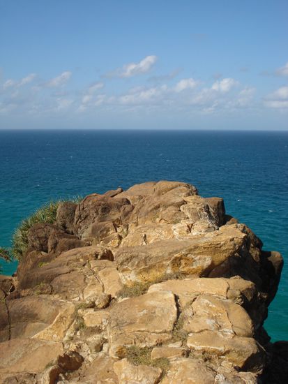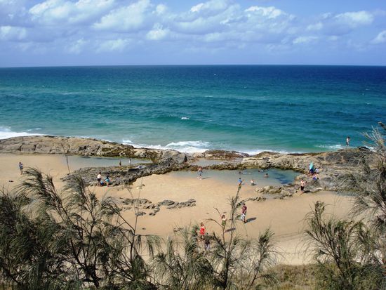 Danach fuhren wir zu den "Champagne Pools". Dabei handelt es sich um steinerne Pools, welche von der Brandung mit Meerwasser gefuellt werden und den Aborigines frueher als Fischfallen gedient haben. Heute kann man in diesen Pool sicher baden ohne den Gefahren des Pazifiks ausgesetzt zu sein. Und diese sind zahlreich. Baden im offenen Ozean ist wegen der starken Stroehmung, den Haien und den Quallen nicht unbedingt zu empfehlen . "If you go into the ocean, you'll die!", sagte Graham immer ganz bestimmt. Nicht es KOENNTE gefeahrlich sein, nein: "you'll die, for sure!"