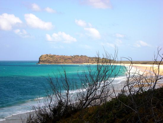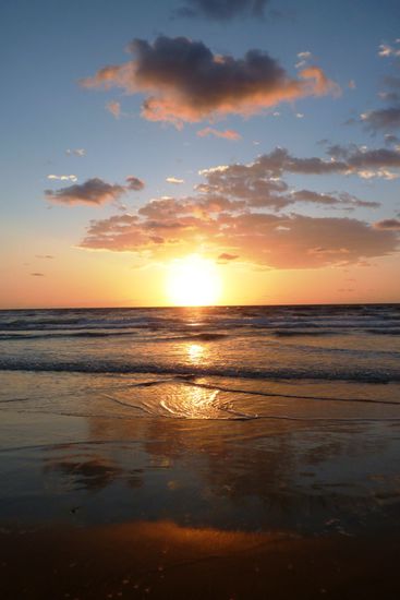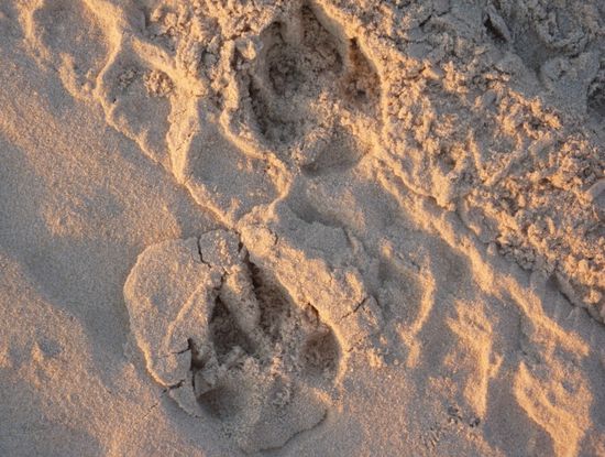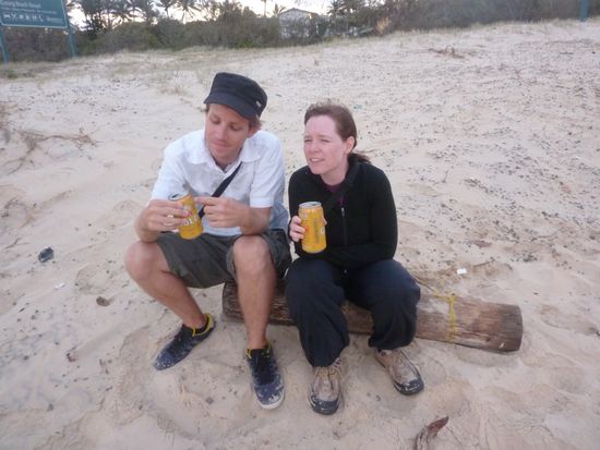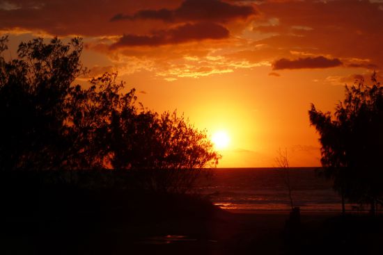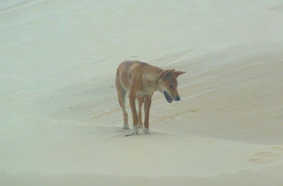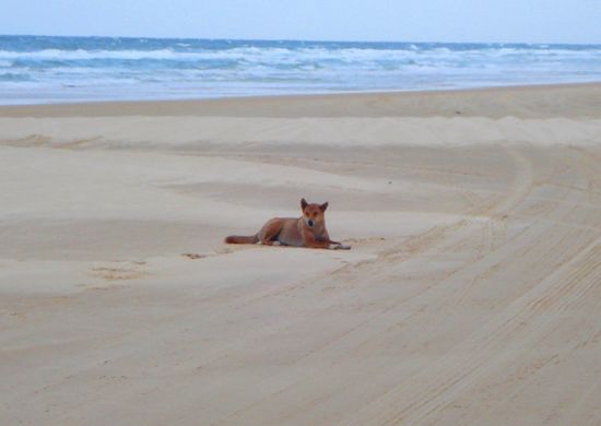 Auf der Rueckfahrt zum "Eli Creek" hatten wir unsere erste Begegnung mit einem Dingo! Ploetzlich stand einer am Strand und beobachtete den Bus. Die Dingos auf Fraser Island stehen unter besonderem Schutz, da es sich diese Population noch weniger mit dem Haushund gekreuzt hat. Eine zweite Begegnung mit einem Dingo hatten wir am Abend, als wir fuer den Sonnenuntergang am Strand waren. Ploetzlich stand wieder einer vor uns! Er verhielt sich eigentlich wie ein normaler Hund ... schueffelte neugirig und war nicht agressiv. Trotzdem ist es einem ein bisschen mulmig zu mute, weil man an allen Info-Tafeln Warnhinweise lesen kann wie man sich bei einer Begegnung mit einem Dingo verhalten muss. Normalerweise sollte ein Erwachsener aber keine Probleme mit einem Dingo haben. Kinder sind mehr gefaehrdet, so wurde zum Beispiel Ende August 09 ein Kind angefallen und im Jahre 2001 wurde ein neun jaehriger Junge sogar von einem Dingo getoetet.